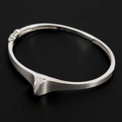 V-förmiges Mittelteil mit 20 chatongefassten Brillanten an strukturierter Stabgliederkette. Kastenschloss mit Achtersicherung. 2 Verlängerungsglieder