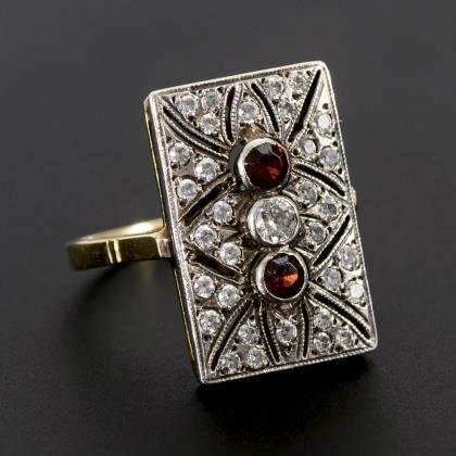 Millegriffesringkopf mit zargengefasstem Brillant, 2 Granaten und farblosen Imitationen. Schmale Schiene