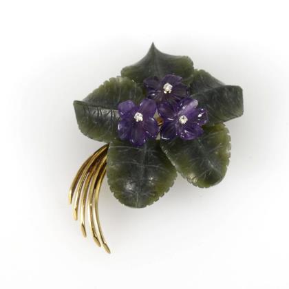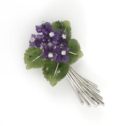 Veilchenbrosche mit Amethysten, Nephrit-Jade und Diamanten.