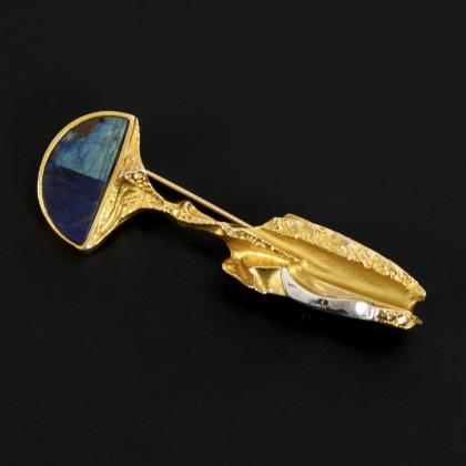Plastisch gestaltete Frauenschuh-Blüte mit farbigem Transluzidemail und partiell eingelassenen Markasiten