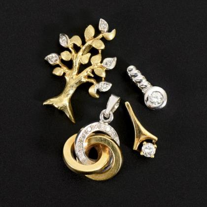 1 Anhänger mit gefasster Zuchtperle (Barock) und kleinem Brillant. 3 verschiedene Anhänger mit kleinen Brillanten