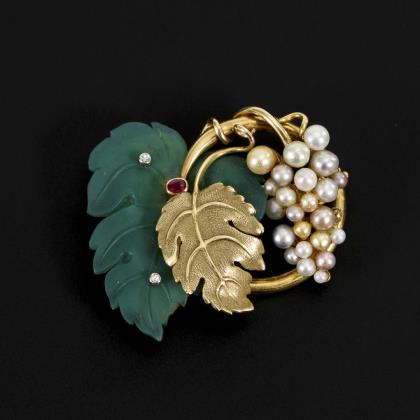 Trauben-Brosche mit Grünachat?, Perlen und Diamanten.