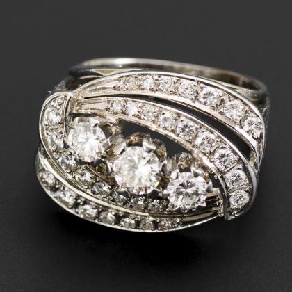 3 chatongefasste Brillanten, umgeben von 17 eingelassenen Brillanten und 14 Diamanten, zwischen mehrstegiger Schulter und mittlerer Schiene