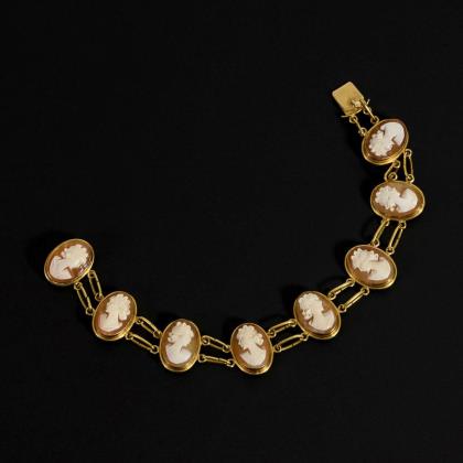 Kameen mit geschnittenen Mädchenprofilköpfen in Zargenfassungen. Mittlere Schiene. Steckmechanik