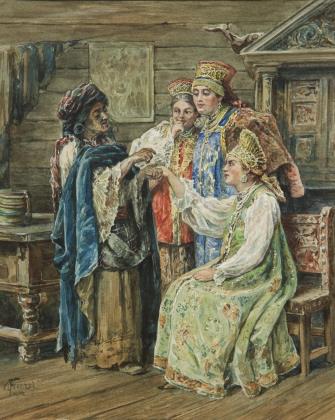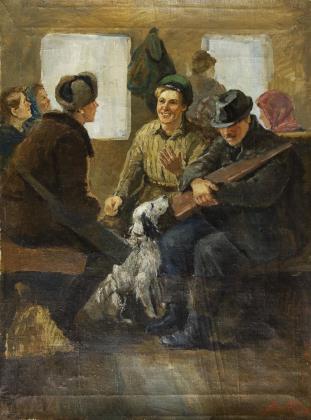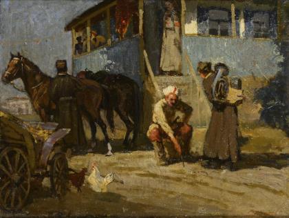 Genreszene in extremen Querformat. Rückseitig kyrillisch bezeichnet, kyrillischer Stempel. Passepartout, profilierter Goldrahmen