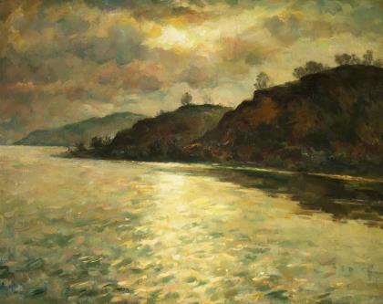 Russischer Maler: Landschaft mit Fluss.