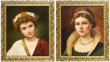 Porträt einer jungen Frau mit Perlenkette und goldenem Haarband sowie Porträt einer jungen Frau mit Blumenkranz im lockigen Haar