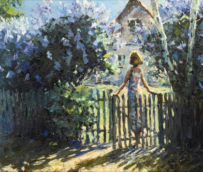 Russischer Maler: Frau am Zaun.