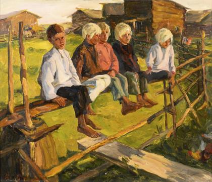Russischer Maler: Dorfjungen im Sonnenschein.