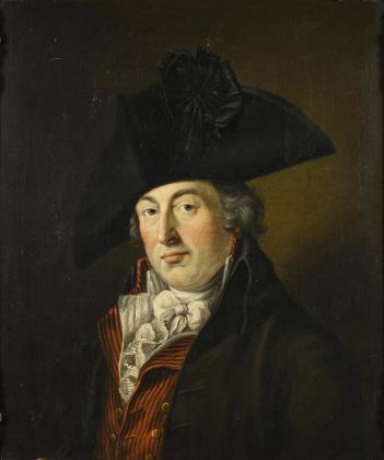 Porträt eines an Napoleon erinnernden Mannes mit Dreispitz und in dunklem Gehrock mit roter Weste und weißem Hemd