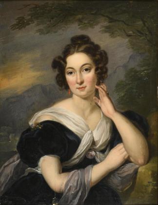 Bildnis einer jungen Dame im dunklen Kleid mit gelocktem Haar und nachdenklichem Blick vor Gebirgslandschaft