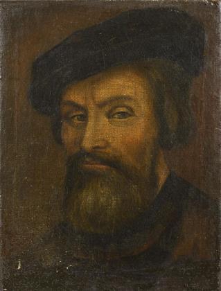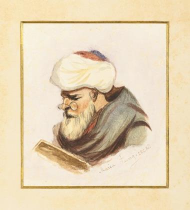 Bildnis eines älteren Mannes mit Turban, Brille und Buch