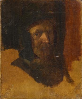 Bildnis eines alten Mannes in brauner Kleidung vor sonniger Landschaft