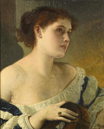 Bildnis einer jungen Frau in weiß-blauem Kleid mit Saiteninstrument