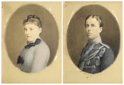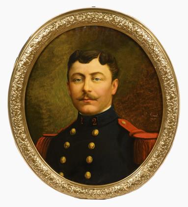 Ovales Porträt eines jungen Mannes in tiefblauer Uniform und mit roten Epauletten