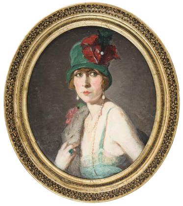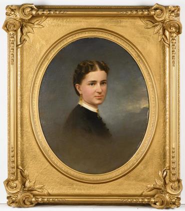 Ovales Bildnis einer jungen Damen im Prunkrahmen.
