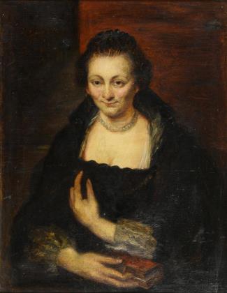 Porträt einer jungen Frau in hochgeschlossenem Kleid mit Goldschmuck vor angedeutetem Wolkenhimmel. Das Bild stammt aus dem unterfränkischen Schloss Ditterswind und zeigt wohl ein Mitglied der Familie Fuchs von Bimbach und Dornheim