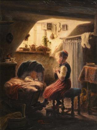 Mädchen beim Stricken und Schaukeln des Babys in der Schlafstube unter dem Dach