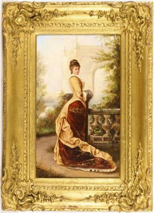 Ganzfiguriges Bildnis einer jungen Frau in herrschaftlichem Kleid an einer Balustrade