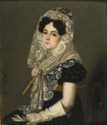 Bildnis einer jungen Frau im schwarzen Kleid mit weißem Schleier und Handschuhen