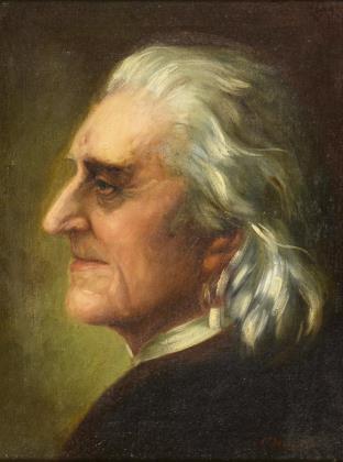 Profilbildnis des Komponisten mit langem weißen Haar vor neutralem Hintergrund