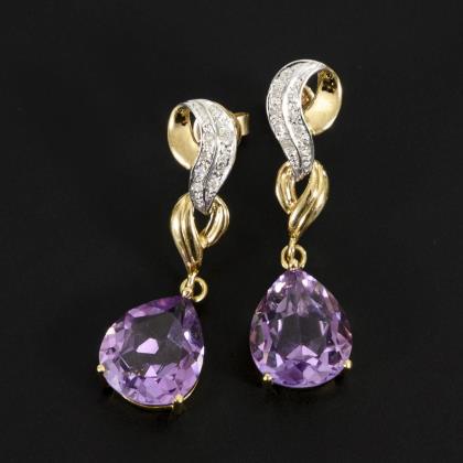 An Schlaufenbrisur mit je 9 kleinen, eingelassenen Diamanten, abgehängter Amethyst. Steckmechanik