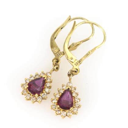 Abhängungen mit krappengefassten Rubinen, umringt von je 14 kleinen Brillanten. Federbügel