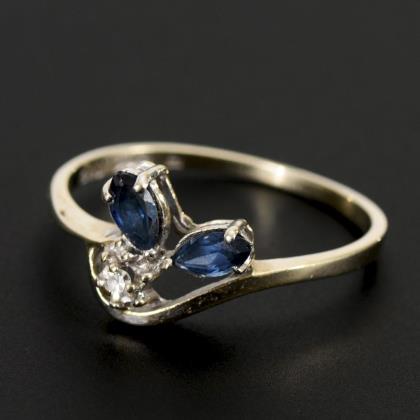 2 Saphirnavetten und kleiner Diamant zwischen schmaler Schiene