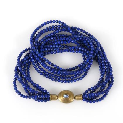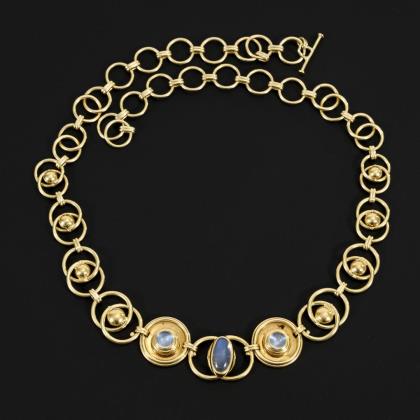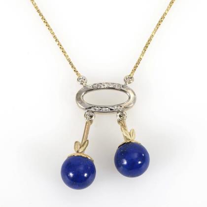 14 krappengefasste Steine zwischen Ringösen an Karabinerschließe. Passender Anhänger mit Blautopas und 3 kleinen Diamanten.