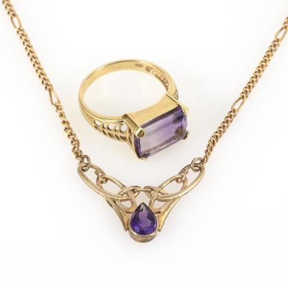 Englisches Collier und moderner Ring mit Amethyst.