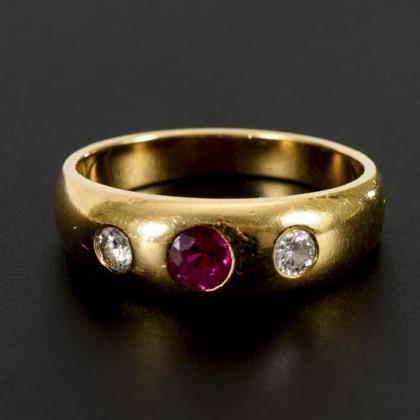 Eingelassener Rubin und 2 Brillanten in mittlerer Schiene