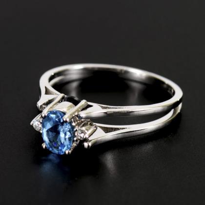 Krappengefasster Saphir, Blautopas und 4 kleine, eingelassene Diamanten, beweglich zwischen 2 schmalen Ringschienen