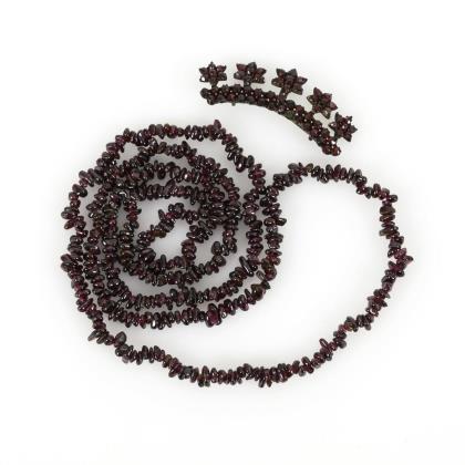 Durchgehende Schnürkette mit Granatstücken und Brosche mit Granatbesatz. Metallbroschierung