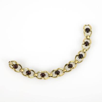 Granatbesetzter Anhänger/Brosche mit verglast gerahmter Rückseite und abnehmbarer Öse, C-Haken. Gliederarmband mit Granatbesatz, an Kastenschloss und Sicherheitskette