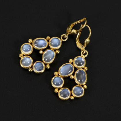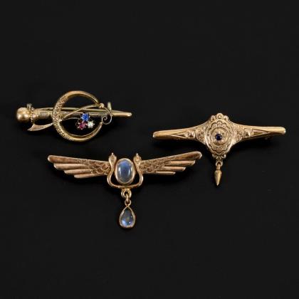 3 reliefierte Broschen mit Mondsteincabochons, Halbperlchen und Saphir. Kugelhaken und C-Haken