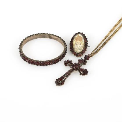 Medaillonanhänger/Brosche und Armband mit Granaten Ende 19. Jh.