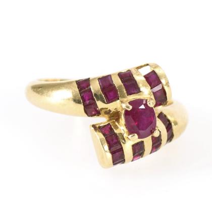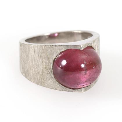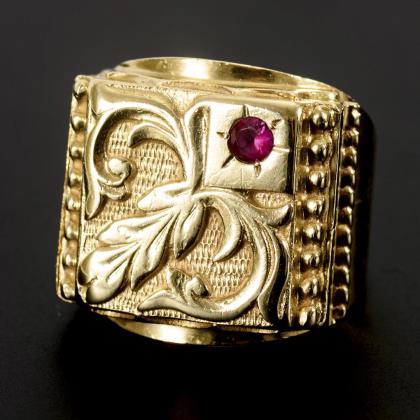 Auf reliefierter Ringkopfplatte eingelassener Rubin. Breite Schiene