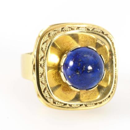 Saphircabochon, umgeben von 10 zargengefassten Brillanten in reliefiertem Ringkopf, zwischen mittlerer Schiene