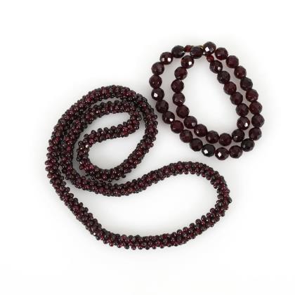 Durchgehende Schnürkette mit Granatkugeln und Schnürkette mit polygonalen Granaten, an Metallringfederschließe