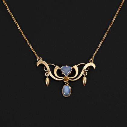 Zargengefasster Cabochon in verziertem Rahmen, an Ankerkette mit Ringfederschließe
