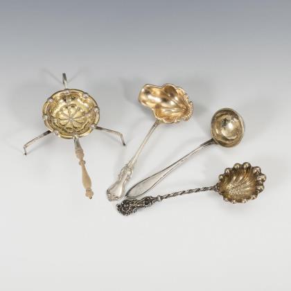 1 Teesieb, 2 Sieblöffel, 1 Kelle, verschiedene Formen und Dekore, teils vergoldet