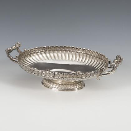 Ovale Schale mit reliefierten Rocaillen und Fruchtkörben am Rand