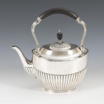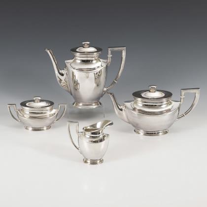 Elegante neoklassizistische Form mit polierten Wandungen und geschwungenen Schultern; die Kannen mit Isolierscheiben aus Bein. Kaffee- und Teekanne, Zuckerdose und Sahnekännchen