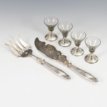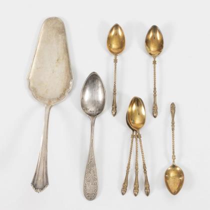 Vergoldete Mokkalöffel mit gedrehtem Stiel, Firmenzeichen Koch & Bergfeld. Tortenheber mit geschweiftem Rand und Blattrelief, Firmenzeichen Bremer Silberwarenfabrik. Kaffeelöffel mit floralen Gravuren, Firmenzeichen Hermann Walter
