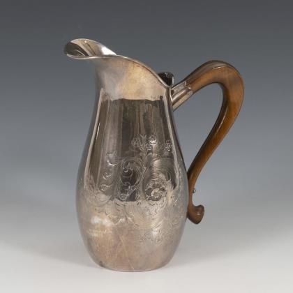 Silberne Wasserkanne mit Holzgriff.
