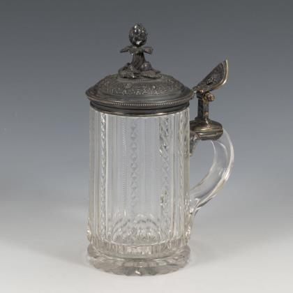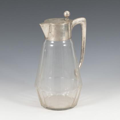 Jugendstil-Karaffe mit Silberhenkel und flachem Scharnierdeckel, darauf Gravur: "HMC 1887 7. Mai 1912". Innen graviert: "Dass edler Rebensaft Euch goldne Tage schafft. Sollt ihr trinken fleissig noch 1937"