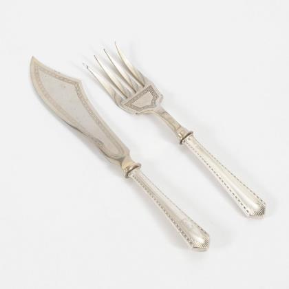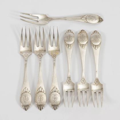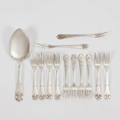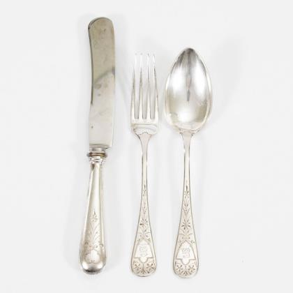 73 Teile: 6 Menügabeln, 6 Menümesser, 6 Suppenlöffel, 12 kleine Gabeln, 6 kleine Messer, 6 Dessertlöffel, 12 Kuchengabeln, 14 Kaffeelöffel und 5 Vorlegeteile. Teils mit Monogrammgravur "S". Dazu 1 kleiner schwarzer Besteckkasten "H. & E. R. 14. Juni 1890"