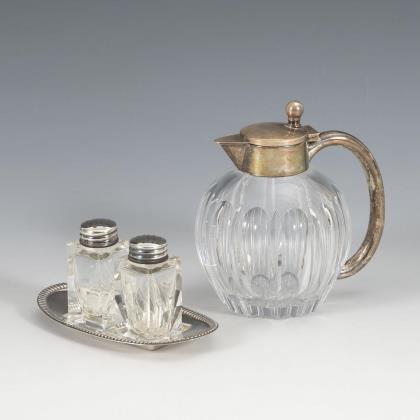 Bauchiges Kännchen mit Silbergriff und flachem Scharnierdeckel (H 11,5 cm). Kleines ovales Silbertablett mit 2 Streuern aus Glas (L 11,5 cm)