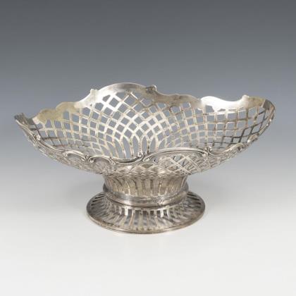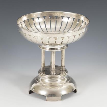 Linear durchbrochene Silberschale auf 4 säulenartigen Stützen und Rundfuß