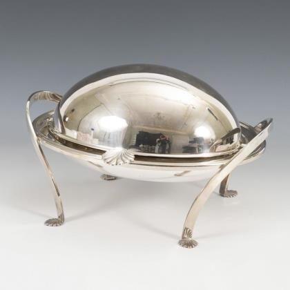 Ovoider Korpus, auf vier Beinen mit Muschelfüßen. Innen Glasschale und Abdeckplatte. Zum Wärmen und Kühlen von Speisen